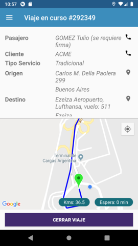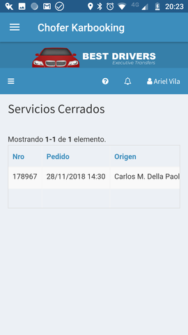 Una vez que el servicio haya sido controlado por un operador de Remises Transtrip, el mismo aparecerá en la pantalla de Servicios Cerrados y no podrá modificarse