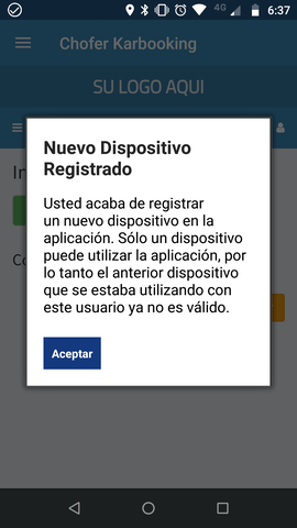 Nuevo Dispositivo Registrado Usted acaba de registrar un nuevo dispositivo en la aplicación. Sólo un dispositivo puede utilizar la aplicación, por lo tanto el anterior dispositivo que se estaba utilizando con este usuario ya no es válido.