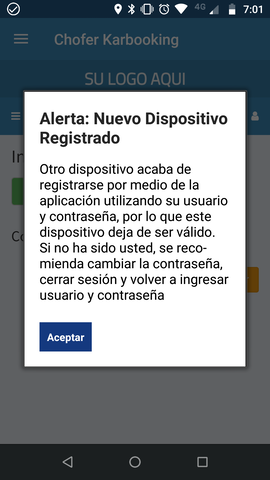 Alerta: Nuevo Dispositivo Registrado Otro dispositivo acaba de registrarse por medio de la aplicación utilizando su usuario y contraseña, por lo que este dispositivo deja de ser válido. Si no ha sido usted, se recomienda cambiar la contraseña, cerrar sesión y volver a ingresar usuario y contraseña