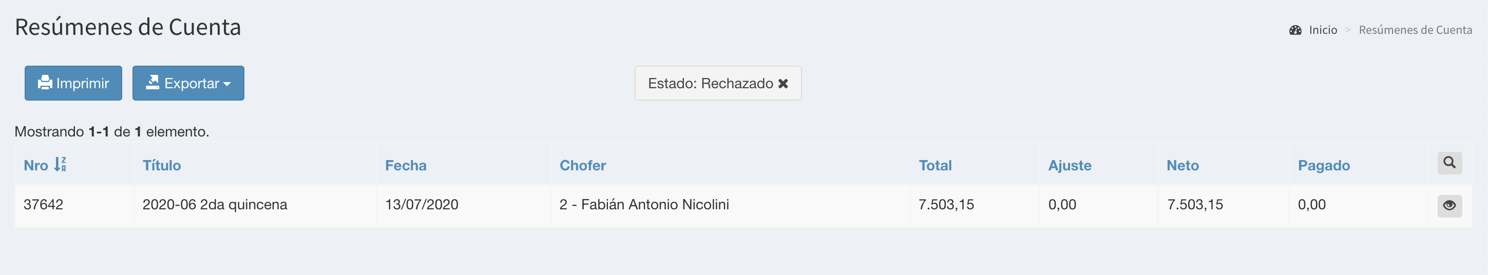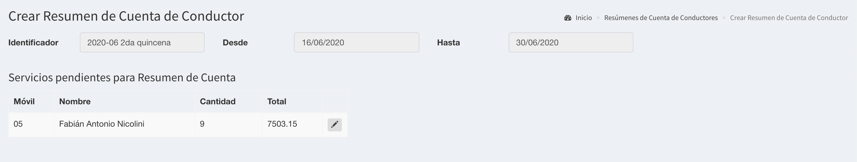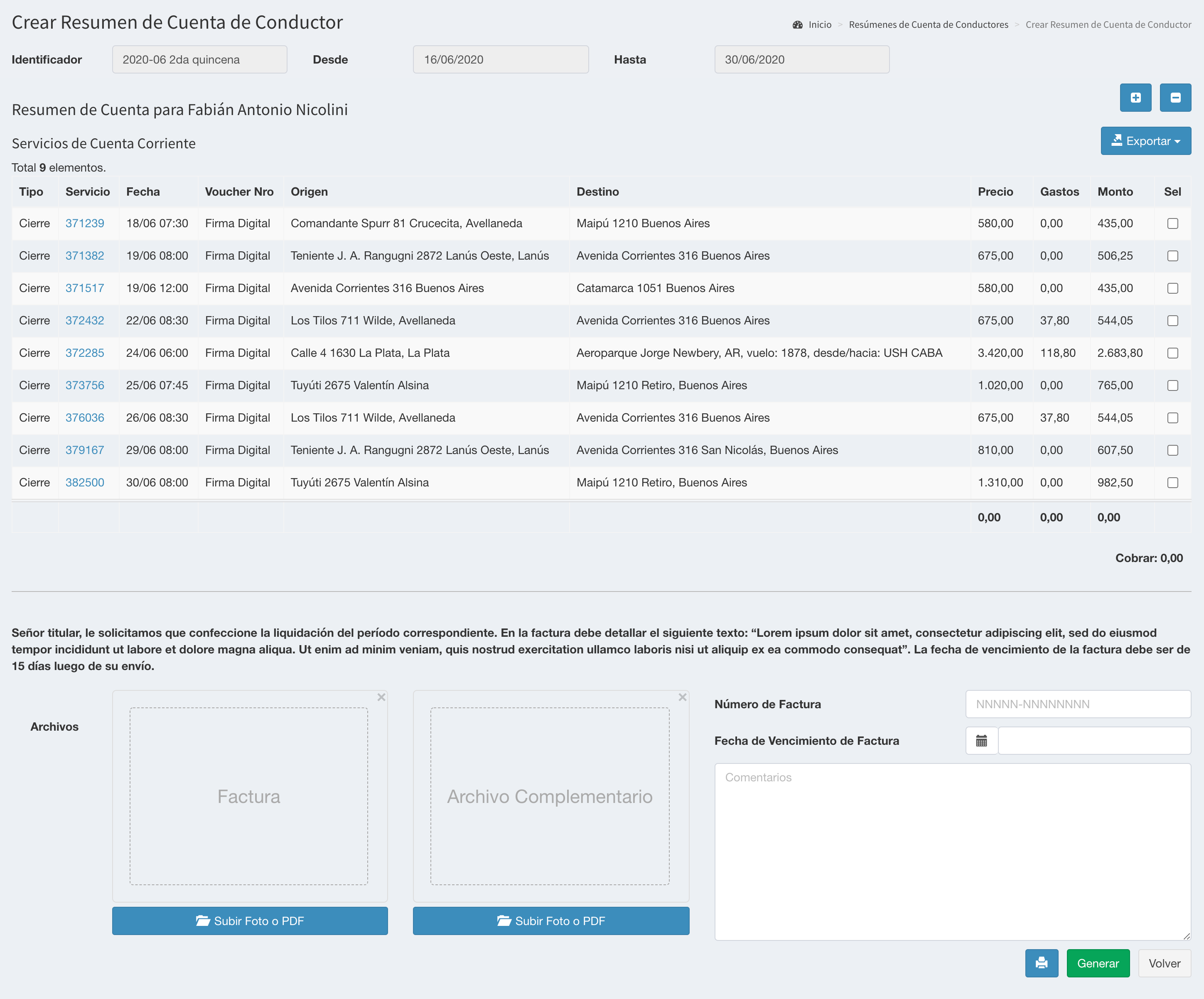 Tabla de Contenidos Titular Crea Resúmenes de Cuenta Alerta Selección del Conductor Creación del Resumen de Cuenta Resumen Aprobado Resumen Rechazado Volver a la aplicación Titular Crea Resúmenes de Cuenta Alerta Remises Transtrip define el período de los servicios que se pueden incluir en el resúmen de cuenta. También define el período de fechas durante las cuales se encontrará habilitada esta funcionalidad. Durante este período, los titulares reciben una alerta y/o email que les indica que deben crear los resúmenes de cuenta de los conductores que tienen a cargo. Selección del Conductor Al ingresar el titular ve la siguiente pantalla, donde debe seleccionar cada uno de los conductores que tiene a cargo. Para cada caso se visualiza también la cantidad de servicios incluidos en el período habilitado. Creación del Resumen de Cuenta Luego de seleccionar cada conductor, accede a la pantalla de creación del resumen de cuenta, donde debe seleccionar los servicios que serán incluidos en el resumen de cuenta. En caso de contar con servicios con IVA, se mostrará una columna adicional que detallará el monto que debe indicar en la factura Presionando los botones y puede seleccionar o anular la selección de todos los servicios. El botón Exportar permite exportar los servicios seleccionados. A continuación se muestran las instrucciones de la solicitud y el formulario de creación del resumen de cuenta: Factura: Debe adjuntar la factura correspondiente al presente resumen de cuenta, confeccionada de acuerdo a las instrucciones provistas. Archivo Complementario: De acuerdo a las instrucciones de la agencia, el titular deberá adjuntar un archivo complementario Número de Factura: El titular debe ingresar el número de factura que corresponde con el archivo adjuntado Fecha de Vencimiento de Factura: El titular debe ingresar el la fecha de vencimiento de la factura que corresponde con el archivo adjuntado Comentarios: El titular puede ingresar comentarios en caso de que sea necesario El botón imprimir un borrador del resumen de cuenta El botón Generar permite la creación del resúmen de cuenta. Al presionarlo, su estado es Esperando Agencia, que deberá revisarlo pudiendo aprobarlo o rechazarlo, detallando en los comentarios los motivos. Resumen Aprobado La agencia procederá a la actualización de la cuenta corriente. Resumen Rechazado El titular recibirá una alerta que le lo dirigirá al resumen rechazado: El titular deberá presionar Generar Resumen de Cuenta Nuevamente y deberá volver a crearlo Volver a la aplicación
