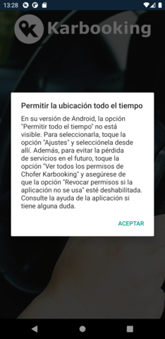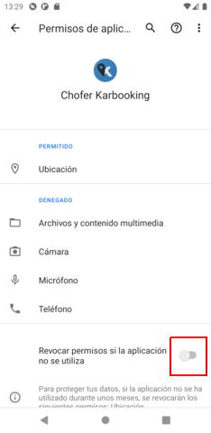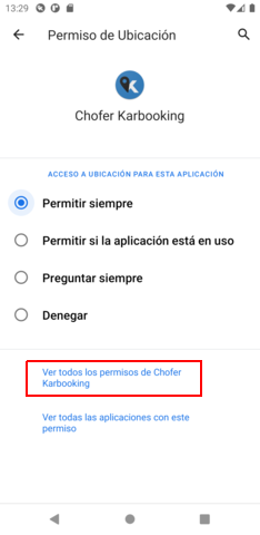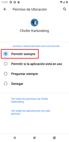 Volver a la aplicación Cambios en el permiso de ubicación con la actualización de Android 11 Si su dispositivo ejecuta Android 11 o superior, la autorización del permiso de seguimiento de la ubicación “Todo el tiempo”, que es requerido para utilizar la aplicación, no esta visible en la selección de inicial.Para habilitarlo toque la opción “Ajustes” resaltada a continuación.Luego, será llevado a la configuración específica de la ubicación para la aplicación. Seleccione la opción Permitir siempre para que la aplicación continúe funcionando como se esperaba.Existe una nueva configuración adicional con Android 11 para evitar la pérdida de servicios en el futuro. Desde esta página, toque la opción Ver todos los permisos para acceder a estas configuraciones.Será llevado a la siguiente pantalla. En la parte inferior de la página, asegúrese de que la opción Revocar permisos si la aplicación no se utiliza esté deshabilitado como se muestra. Esto permitirá que la aplicación continúe rastreando viajes, incluso si no la abre con regularidad. Volver a la aplicación