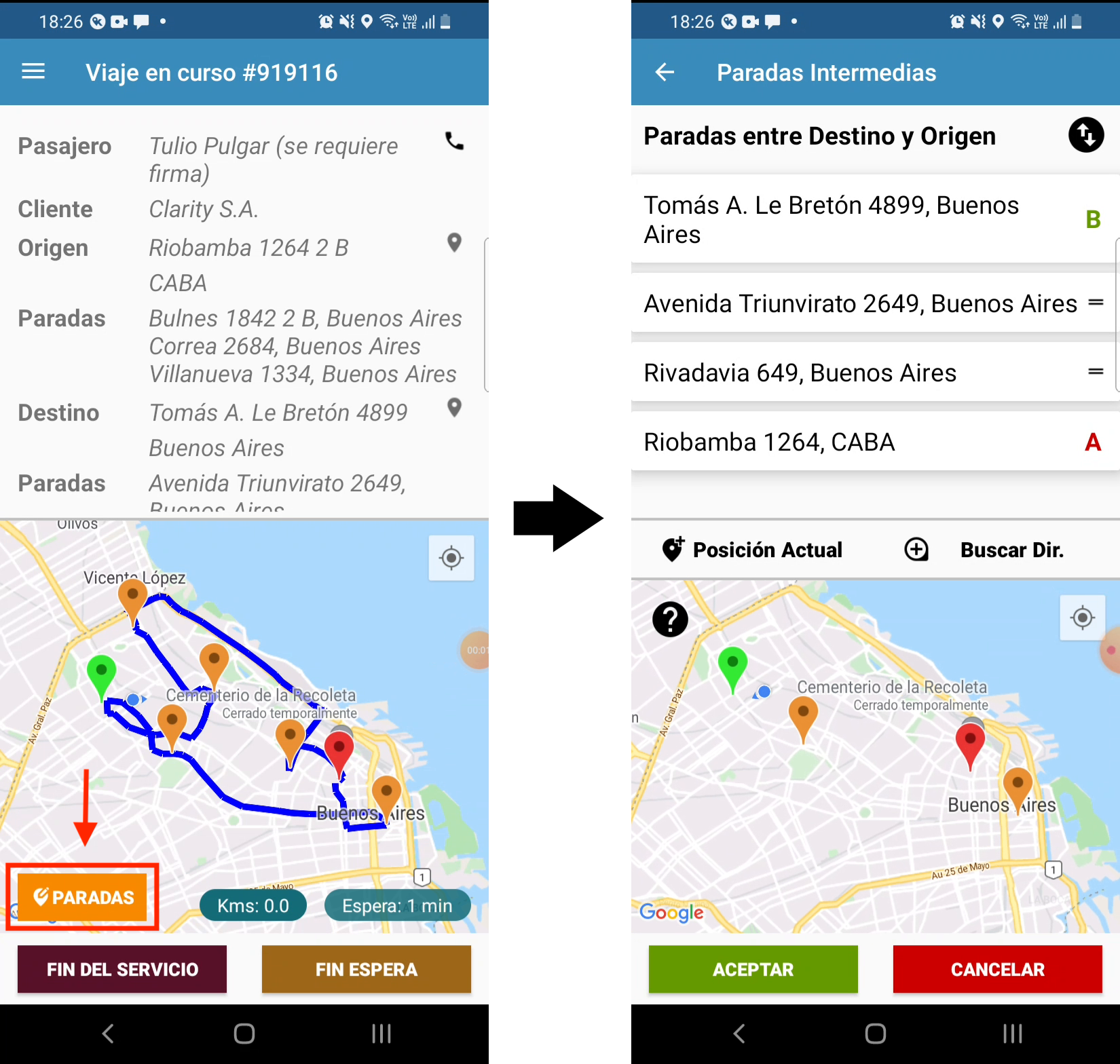 Tabla de Contenidos Paradas Intermedias Detalle del funcionamiento Video demostración Volver a la aplicación Paradas Intermedias La app le permite agregar, eliminar y modificar el orden de las paradas intermedias del servicio. Puede agregar una parada intermedia que no estaba planificada con unos pocos toques mientras se encuentra en espera. También puede corregir las paradas al momento del cierre del servicio. Detalle del funcionamiento Paradas: Este botón le permite acceder a esta funcionalidad. Se encuentra disponible: Cuando se encuentra En Espera En el menú principal de la pantalla de viaje en curso En la pantalla de cierre del servicio Este botón aparece cuando el servicio es con retorno. Permite seleccionar las paradas del tramo de ida (entre la dirección de origen y destino) o el tramo de vuelta (entre la dirección de destino y origen) Posición Actual: Permite agregar la posición actual como una nueva parada1) 2) Buscar Dirección: Permite buscar una dirección y agregarla como una nueva parada3) Presione la parada durante un segundo para arrastrar hacia arriba y abajo las paradas en caso de ser necesario ordenarlas4) Arrastre a izquierda o derecha las paradas para eliminarlas5) Puede utilizar la funcionalidad de App Test para probarlo! Video demostración Cuando se encuentra En Espera presiona el botón Paradas Cierra la pantalla de ayuda, indica que no se vuelva a mostrar Selecciona el tramo de vuelta para editar las paradas entre el destino y el origen Presiona el botón Posición Actual para agregar la parada actual Elimina la parada arrastrando hacia la derecha Presiona el botón Buscar Dirección para buscar la dirección precisa Arrastra la parada agregada hacia arriba para ubicarla en el orden correcto Presiona el botón Aceptar para confirmar la edición de las paradas Volver a la aplicación 1) , 3) Las paradas intermedias se agregan como última parada. En caso de ser necesario, arrástrela luego para arriba según el orden correspondiente 2) Es posible que la posición detectada por el teléfono no corresponda exactamente con la dirección deseada. En ese caso, elimine la parada y agréguela nuevamente por medio de la búsqueda de dirección 4) Las direcciones de origen (A) y destino (B) no pueden ser reordenadas 5) Las direcciones de origen (A) y destino (B) no pueden ser eliminadas