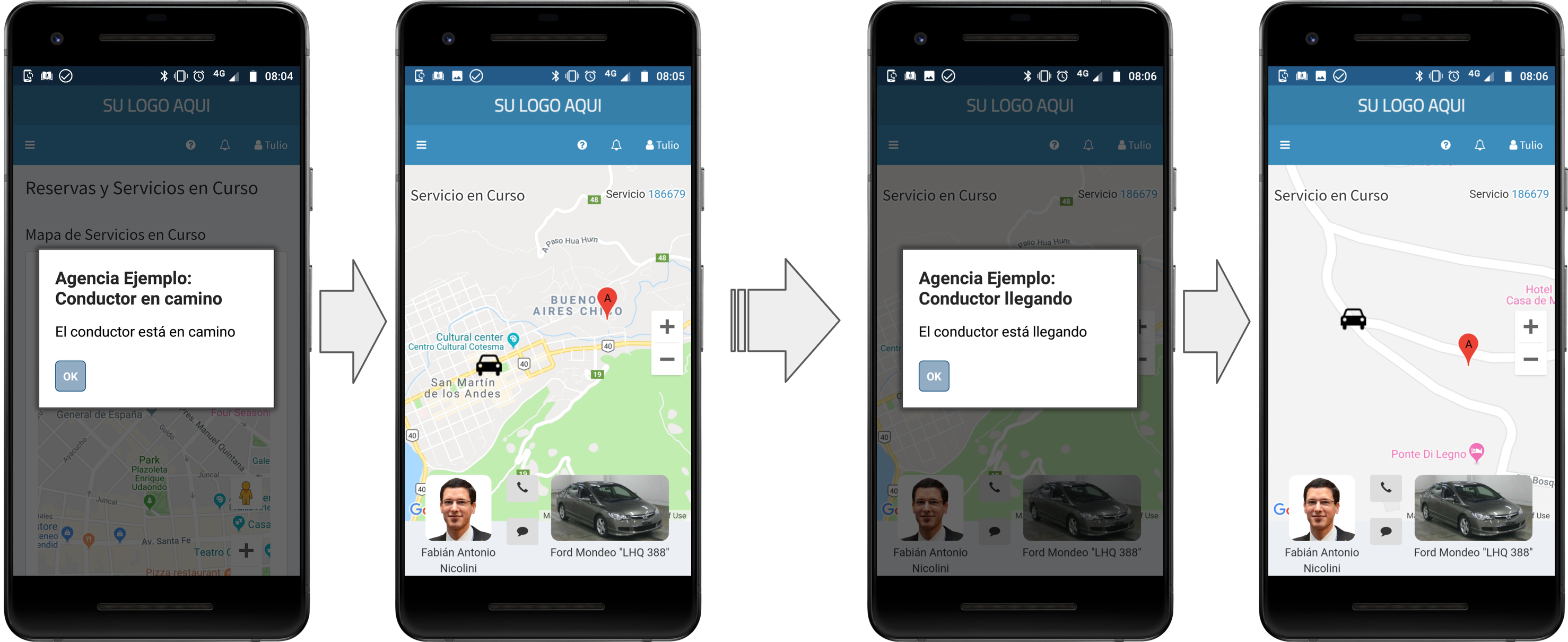 Si el pasajero tiene la app instalada, recibirá una alerta al despacharse el servicio y cuando el móvil esté a menos de 200 metros de la dirección de Origen. Ver Parámetros para conocer cómo configurar esta funcionalidad