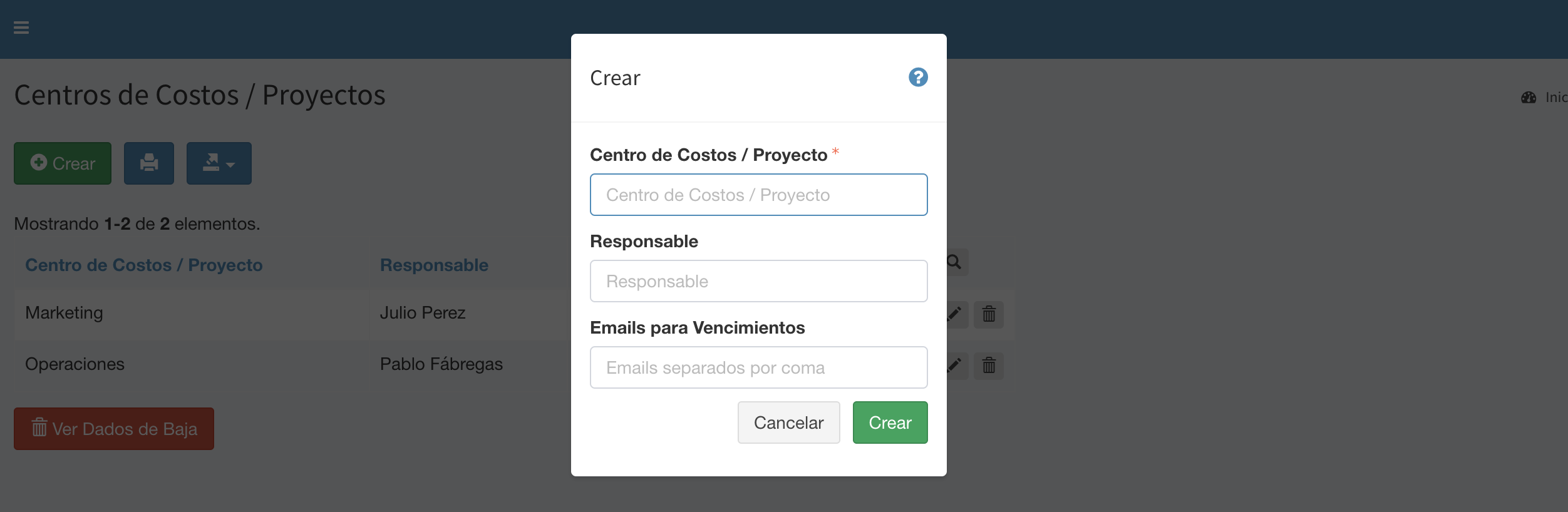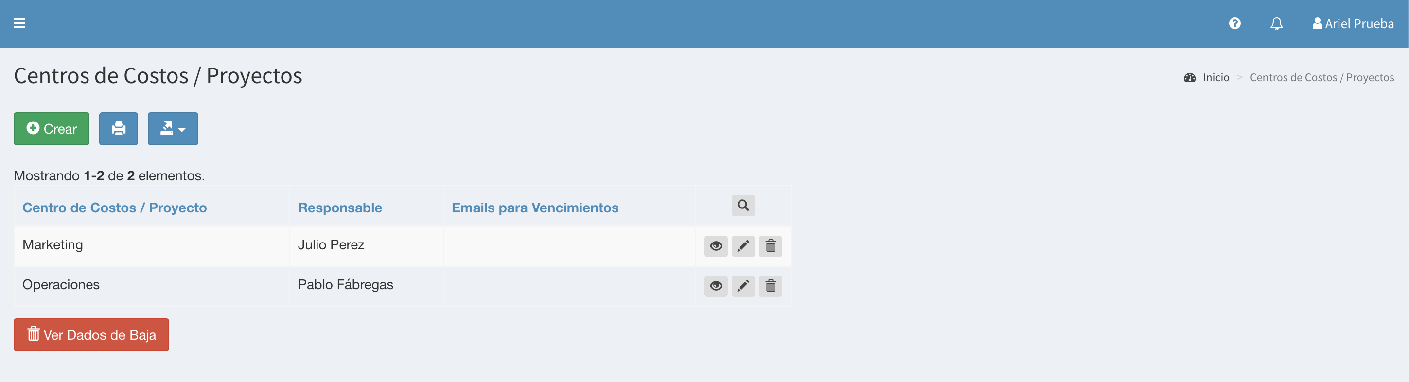 Tabla de Contenidos Centros de Costo Listado Crear Centro de Costo Centros de Costo Listado Al ingresar a la opción Centros de Costos se muestra el listado de centros de costos de la empresa. La visualización de esta funcionalidad depende de los permisos del usuario conectado. La ayuda en línea está confeccionada para un usuario con rol de Gerente, que puede ver todas las funcionalidades. Otros roles de usuarios pueden ver menos opciones. Crear Centro de Costo Presionando el botón Crear se accede al formulario de creación de centros de costo.