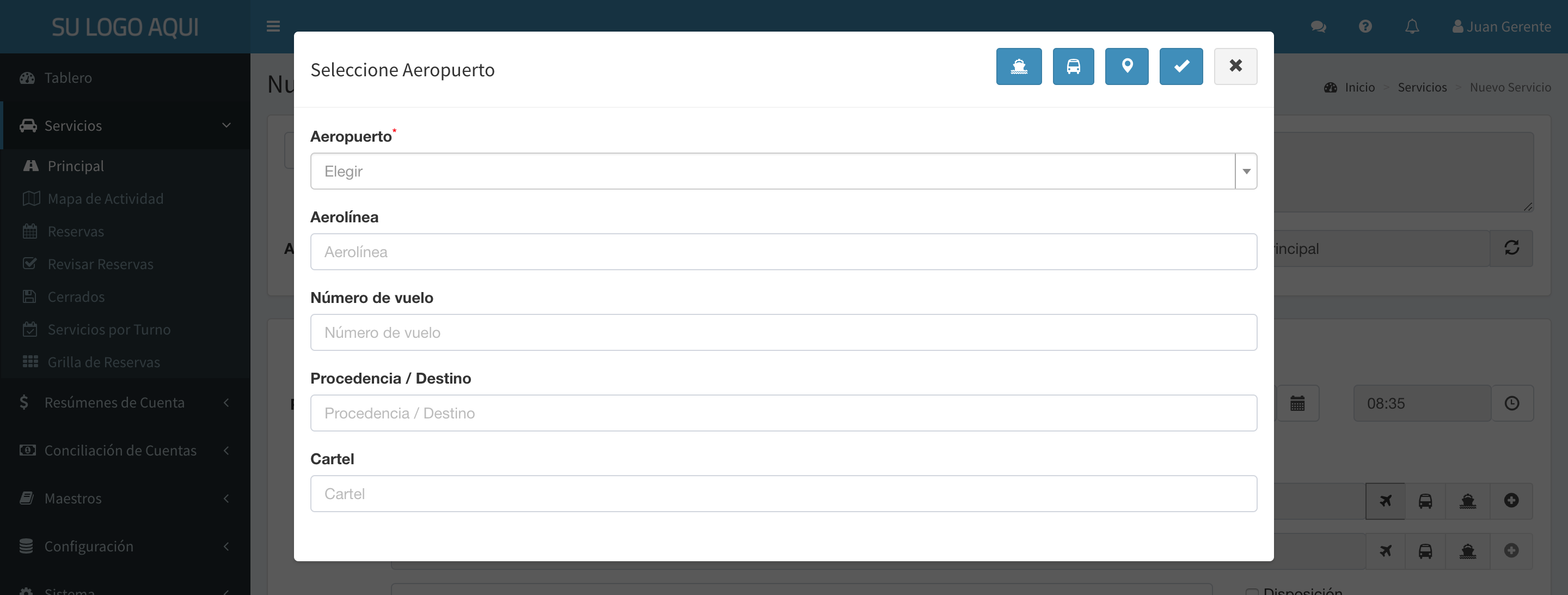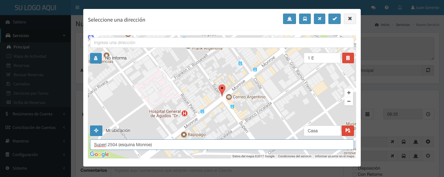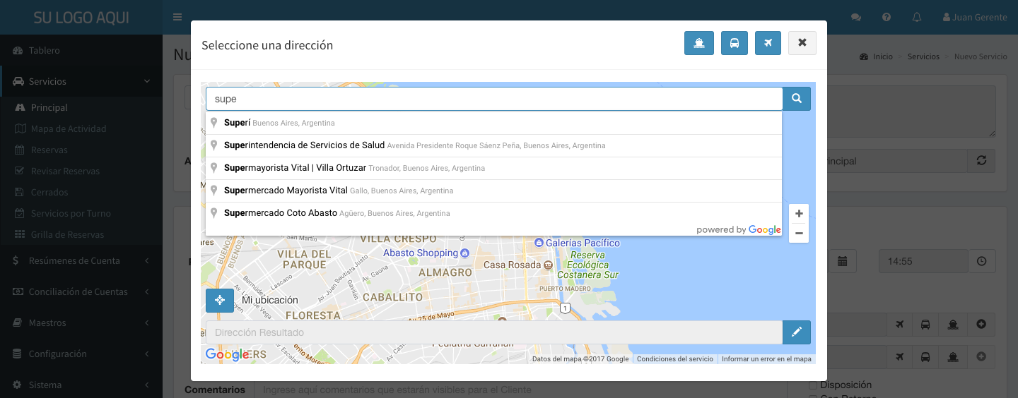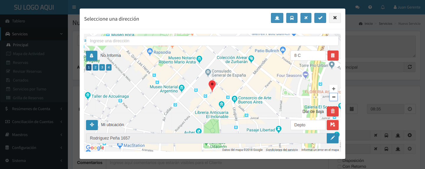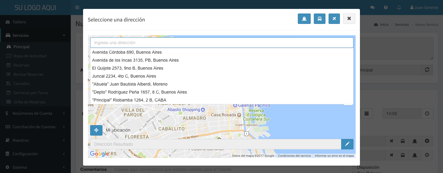 Tabla de Contenidos Ingreso de Direcciones Selección Básica Botones Principales Selección de Aeropuerto Selección de Terminal Terrestre Selección de Puerto Ingreso de Direcciones Selección Básica Al hacer click en el campo de dirección, se muestra la ventana de selección de direcciones. Al presionar la tecla para abajo o comenzar a escribir, la ventana muestra las anteriores direcciones utilizadas para ese cliente: Si el texto ingresado no se encuentra en la lista, se busca en Google Maps®: Al presionar ENTER o hacer click en se posiciona el marcador en la dirección encontrada. Botones Principales Se detalla a continuación la función de cada botón de la pantalla de selección de direcciones: Permite cambiar al modo de Selección de Aeropuerto Permite cambiar al modo de Selección de Terminal Terrestre Permite cambiar al modo de Selección de Puerto Confirma la dirección seleccionada Cancela la selección de dirección Permite especificar el piso y número de departamento, u otra indicación adicional (por ejemplo, número de intercomunicador, torre, etc) Permite ingresar un nombre para esta dirección y guardarla para utilizarla nuevamente en el futuro. Permite eliminar el nombre guardado para la dirección seleccionada. Posiciona el marcador en la posición actual Eliminar la dirección seleccionada de la lista Permite editar la calle y número encontrada por Google Maps® para otorgar mayor precisión al chofer en caso de ser necesario. Por ejemplo, puede agregar “esquina Monroe” Botones que aparecen en caso de haber registrado múltiples pasajeros. Permiten seleccionar el pasajero desde el cual se obtiene la lista de direcciones utilizadas Arrastrar el marcador Arrastrando el marcador con el mouse es posible modificar la ubicación encontrada por Google Maps® en caso de que sea incorrecta, o necesitemos mejor presición (por ejemplo, al buscar “Monumental”, Google Maps® ubica el marcador en el centro del estadio, pero para encontrar el recorrido es preferible ubicarlo en la calle de acceso) Ejemplo Se muestra un ejemplo de la utilización de estas funciones: Esta selección tendrá como resultado: “Casa” Superí 2504 (esquina Monroe) 1 E, Buenos Aires, y se guardará con el nombre Casa Selección de Aeropuerto Al presionar en la pantalla principal de Ingreso de Direcciones se pasa al modo de Selección de Aeropuerto: Esta pantalla simplifica la selección de aeropuertos y el resto de los datos sugeridos para este tipo de ubicaciones. Si se trata de la dirección de Orígen, será obligatorio ingresar la Terminal (Aeropuerto), la Empresa de Transporte (Aerolínea) y el Número de Vuelo. De lo contrario, sólo la Terminal es obligatoria. Permite volver al modo de Selección Básica Selección de Terminal Terrestre Al presionar en la pantalla principal de Ingreso de Direcciones se pasa al modo de Selección de Terminal Terrestre (Bus, Tren, etc): Esta pantalla simplifica la selección de terminales y el resto de los datos sugeridos para este tipo de ubicaciones. Si se trata de la dirección de Orígen, será obligatorio ingresar la Terminal y la Empresa de Transporte. De lo contrario, sólo la Terminal es obligatoria. Permite volver al modo de Selección Básica Selección de Puerto Al presionar en la pantalla principal de Ingreso de Direcciones se pasa al modo de Selección de Puerto (Fluvial o Marítimo): Esta pantalla simplifica la selección de terminales y el resto de los datos sugeridos para este tipo de ubicaciones. Si se trata de la dirección de Orígen, será obligatorio ingresar la Terminal y la Empresa de Transporte. De lo contrario, sólo la Terminal es obligatoria. Permite volver al modo de Selección Básica