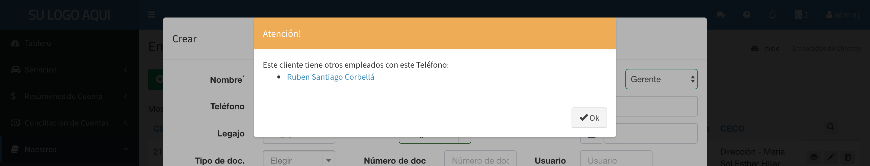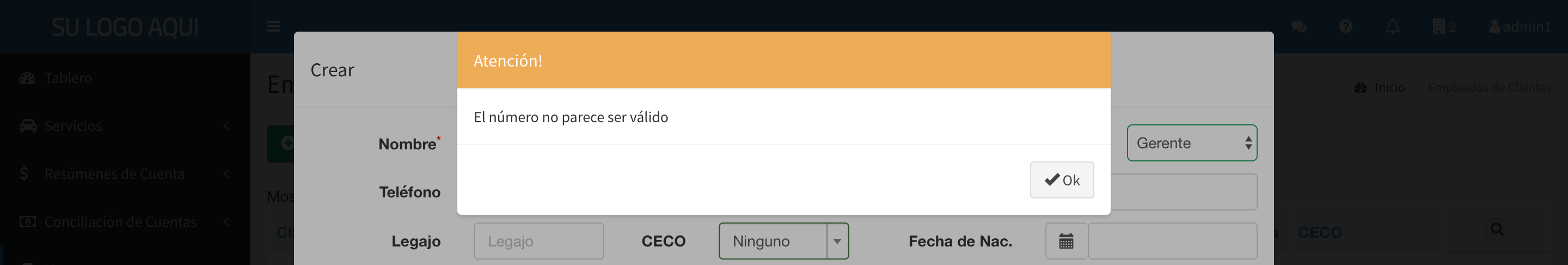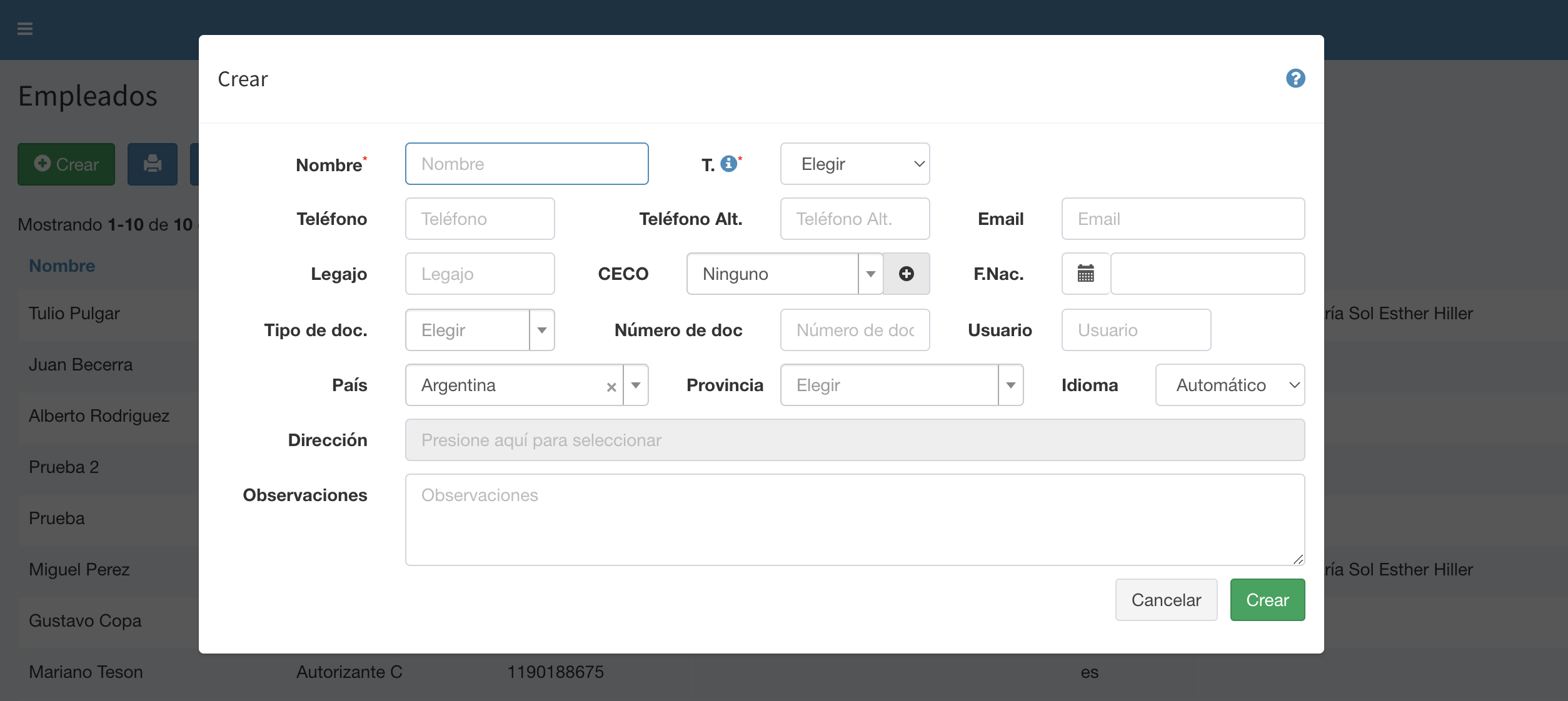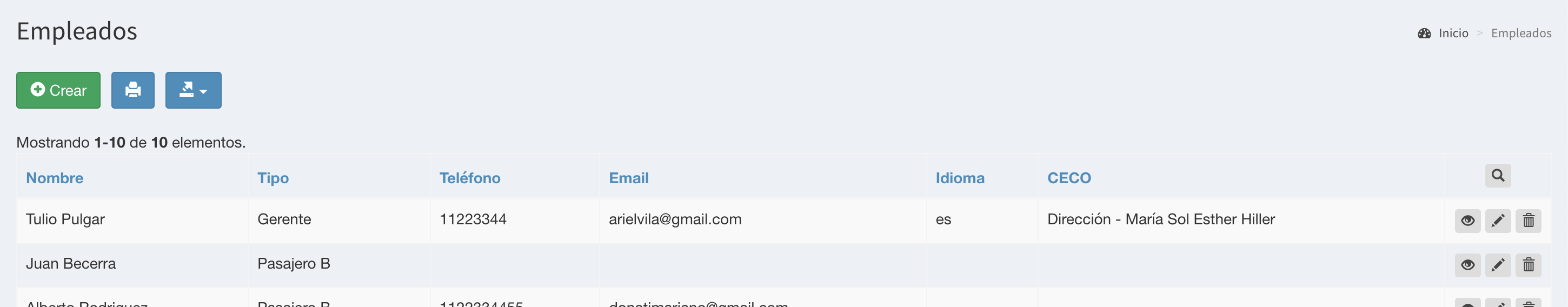 Tabla de Contenidos Empleados / Pasajeros Listado Crear Empleado Controles Empleados / Pasajeros Listado Al ingresar a la opción Empleados se muestra el listado de los empleados de la empresa. Los empleados tienen cinco categorías. Cuando se crea un usuario, se lo debe vincular con un Empleado, lo que permite otorgarle los permisos correspondientes de acuerdo a su categoría: Gerente: Estos usuarios pueden ver los comprobantes (facturas, notas de crédito) y movimientos de balance. Además pueden autorizar servicios para cualquier pasajero, ver todas las reservas, servicios efectuados y pagos electrónicos. Pueden crear centros de costos, empleados y usuarios. Autorizante A: Estos usuarios ver los comprobantes (facturas, notas de crédito). Además pueden autorizar servicios para cualquier pasajero, ver todas las reservas, servicios efectuados y pagos electrónicos. Pueden crear centros de costos, empleados y usuarios. Autorizante B: Estos usuarios pueden autorizar servicios para cualquier pasajero, ver los pagos electrónicos, las reservas y servicios que ellos mismos autorizaron únicamente. Pueden crear centros de costos, empleados y usuarios. Autorizante C: Estos usuarios pueden autorizar servicios para cualquier pasajero, ver los pagos electrónicos, las reservas y servicios que ellos mismos autorizaron únicamente. Pasajero A: Estos usuarios pueden solicitar servicios, ver sus servicios efectuados, sus reservas y sus pagos electrónicos. Pueden crear centros de costos y seleccionar un centro de costo distinto al que le fue asignado al solicitar un servicio. Pasajero B: Estos usuarios pueden solicitar servicios, ver sus servicios efectuados, sus reservas y sus pagos electrónicos. Pasajero C: Estos usuarios pueden ver sus servicios efectuados, sus reservas y sus pagos electrónicos. Objeto de Mensajería: Categoría a utilizar cuando se envían cajas, tarjetas, etc. Estos datos corresponden a los que se ingresan en los campos de Pasajeros. Al seleccionar el pasajero de un nuevo servicio, se utilizará por defecto el Centro de Costos configurado para ese empleado. La visualización de esta funcionalidad depende de los permisos del usuario conectado. La ayuda en línea está confeccionada para un usuario con rol de Gerente, que puede ver todas las funcionalidades. Otros roles de usuarios pueden ver menos opciones. Crear Empleado Presionando el botón Crear se accede al formulario de creación de los empleados. Nombre: Nombre y Apellido del empleado Tipo: Categoría del empleado (Gerente, Autorizante A, Autorizante B, Autorizante C, Pasajero A, Pasajero B, Objeto) Teléfono, Teléfono Alternativo: Teléfonos del empleado Email: Dirección de email del empleado Legajo: Identificación del empleado en el legajo de la empresa CECO: Centro de costos por default al que se cargan los servicios que efectúa este empleado. Presionando se puede crear un nuevo centro de costos F.Nac: Fecha de nacimiento del empleado Tipo y Número de documento: Utilizado para identificar unívocamente al empleado Usuario: Identificación del Usuario. Es único en todo el sistema País, Provincia, Dirección: Dirección del empleado Idioma: Selección del idioma en que este empleado recibe las comunicaciones Observaciones: Comentarios Controles Si otro(s) empleado(s) de esta empresa tiene(n) el mismo nombre, número, email, legajo y/o documento que el que se ingresa en esta pantalla, el sistema alerta para evitar la duplicación de empleados Cada vez que se ingresa un número de teléfono, el sistema controla que se trate de un número válido