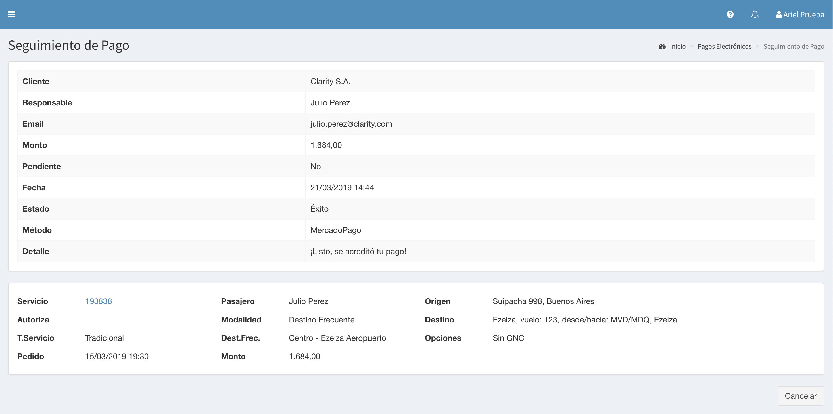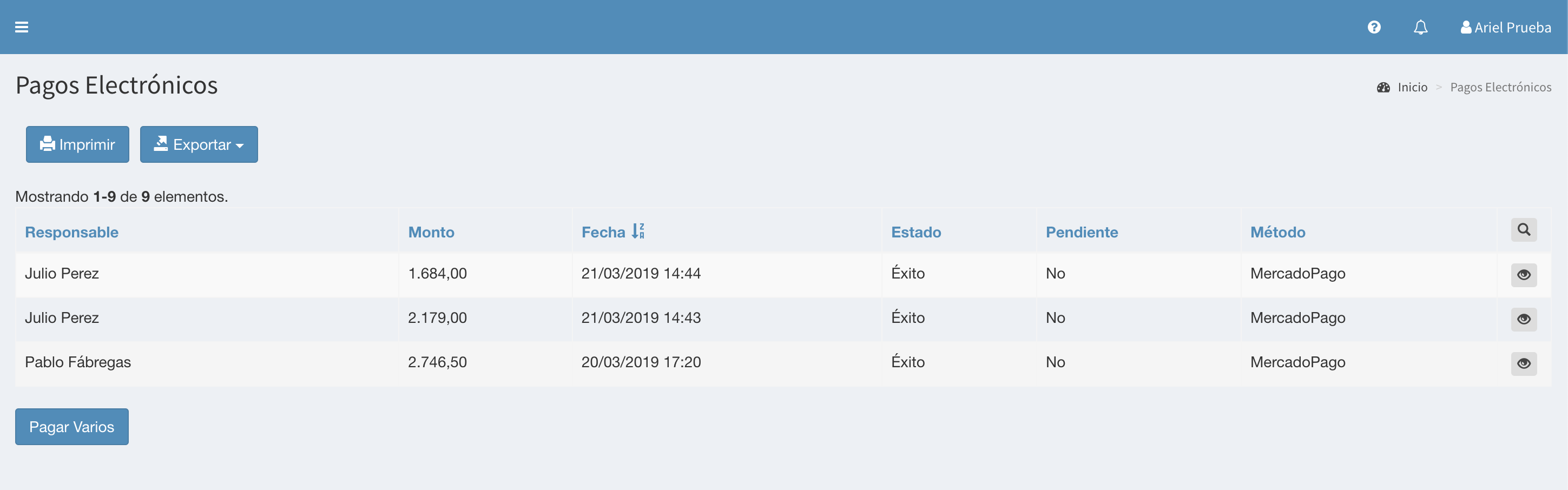 Tabla de Contenidos Pagos Electrónicos Listado Detalle Pagos Electrónicos Listado Al ingresar a la opción Pagos Electrónicos se muestra el listado de pagos electrónicos efectuados. Presionando en Pagar Varios es posible seleccionar varios pagos pendientes y realizar un único pago de los mismos. La visualización de esta funcionalidad depende de los permisos del usuario conectado. La ayuda en línea está confeccionada para un usuario con rol de Gerente, que puede ver todas las funcionalidades. Otros roles de usuarios pueden ver menos opciones. Detalle Presionando sobre un pago electrónico puede ver su detalle.