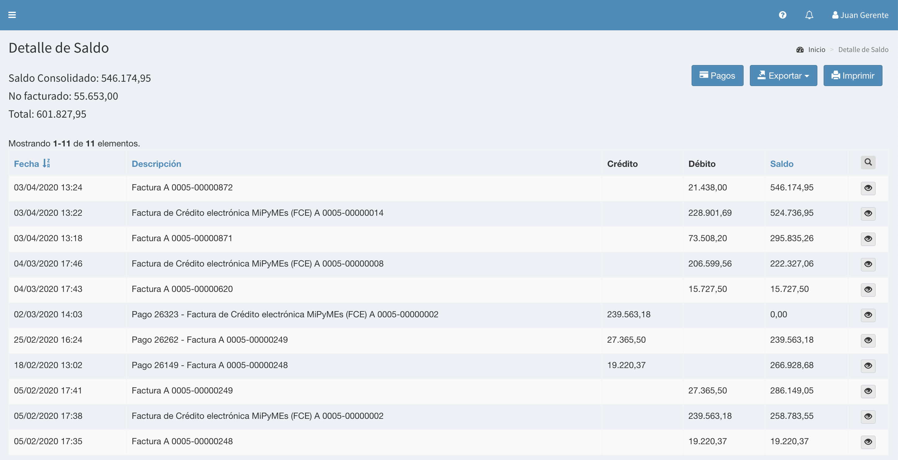Detalle de Saldo Al ingresar a la opción Saldo se muestra el listado de débitos (facturas) y créditos (pagos) correspondiente. Presionando en se accede a la visualización de la Factura, Pago Manual o Pago Electrónico correspondiente. Presionando en Pagos se accede al seguimiento de los Pagos Electrónicos de la empresa. Presionando en puede exportar este listado en Excel y otros formatos. Presionando en puede imprimir este listado en PDF. La visualización de esta funcionalidad depende de los permisos del usuario conectado. La ayuda en línea está confeccionada para un usuario con rol de Gerente, que puede ver todas las funcionalidades. Otros roles de usuarios pueden ver menos opciones. Consulte la Configuración de Roles para más información.