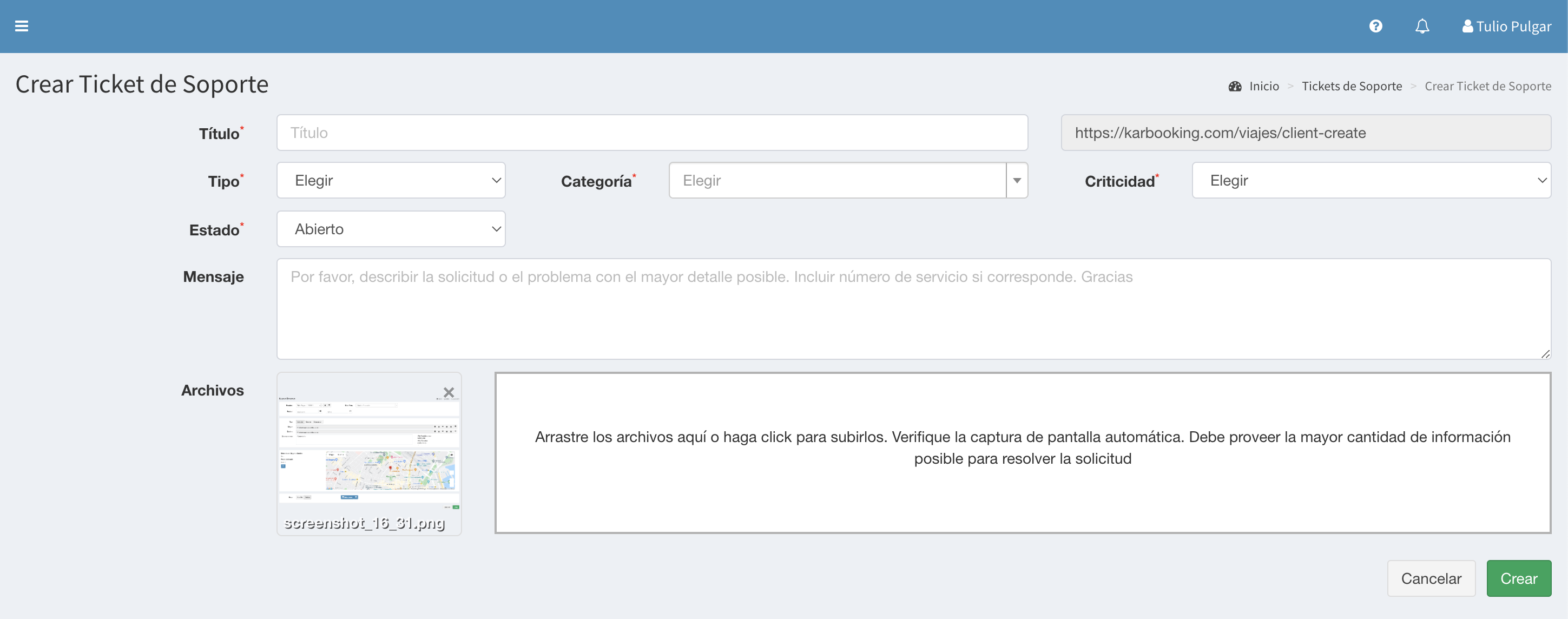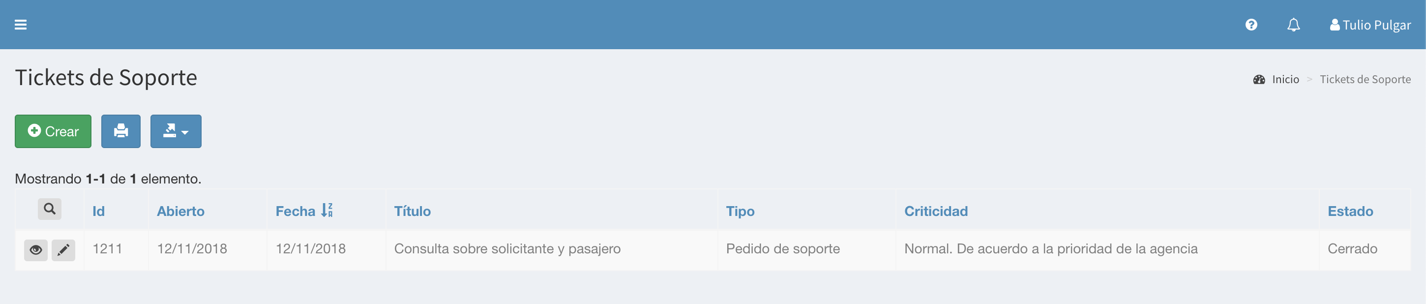 Tabla de Contenidos Tickets de Soporte Crear Ticket de Soporte Listado Ver Respuesta a un Ticket de Soporte Tickets de Soporte Crear Ticket de Soporte Presionando el ícono de la barra superior y luego eligiendo la opción Nuevo Ticket de Soporte, se accede al formulario de creación de tickets. Este formulario pre-cargará el título y la URL de la pantalla en la que se encontraba. Por ejemplo, al crear un Nuevo Ticket de Soporte desde la pantalla de reservas, se ve el formulario siguiente Título: Puede modificarlo para que represente el motivo de su consulta Tipo: Deberá elegir el tipo de Ticket: Pedido de soporte: Cuando necesite soporte o información para realizar alguna acción Error en el sistema: Cuando quiera reportar un bug o error del sistema Pedido de cambio o sugerencia: Cuando quiera realizar una sugerencia de cambio sobre el sistema Categoría: Deberá especificar la categoría del ticket para permitir clasificarlo Criticidad: Deberá especificar la criticidad del ticket: Urgente. No puedo esperar. No es posible continuar con la operatoria hasta que se resuelva el ticket Normal. Utilizado para casos de soporte importantes pero no urgentes Baja. Utilizado para casos de soporte que no son importantes ni urgentes Estado: Especifica el estado actual del ticket: Abierto: El ticket está pendiente de resolución por parte del responsable Inválido: Se utiliza para indicar la invalidez un error reportado Cancelado: Se deja sin efecto el pedido realizado Duplicado: Se cancela el ticket ya que existe otro ticket equivalente Información Pedida: El responsable del ticket puede utilizar este estado para indicar que está esperando información por parte del solicitante Bloqueado: Se puede utilizar este estado para indicar que no se puede continuar con el pedido debido a un impedimento externo Cerrado: El ticket ha sido resuelto Mensaje: Debe describir la consulta, solicitud o sugerencia de la forma más detallada posible Archivos: Puede adjuntar aquí archivos para agregar más detalle a su solicitud. Es importante que incluya una captura de pantalla siempre que sea posible. Si está creando el ticket desde una PC, el sistema captura automáticamente la pantalla desde la que presionó Nuevo Ticket de Soporte y la agrega como archivo adjunto. Listado Presionando el ícono de la barra superior y luego “Ver todos los tickets” se muestra el listado de los tickets de soporte creados por el usuario conectado Ver Respuesta a un Ticket de Soporte Una vez que Remises Transtrip responda su ticket, el ícono se verá de la siguiente manera Presionando en “Ver respuesta de Soporte” se accede a la pantalla de Consulta del ticket.