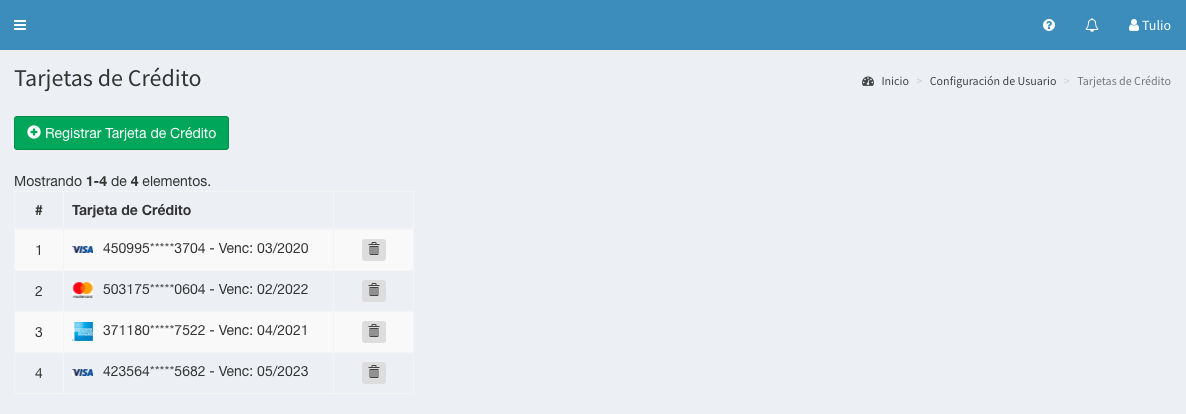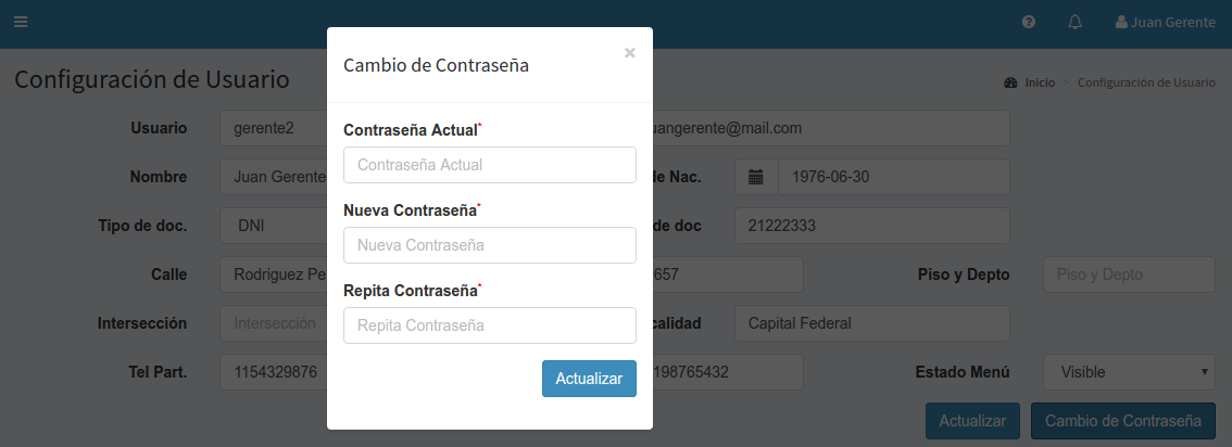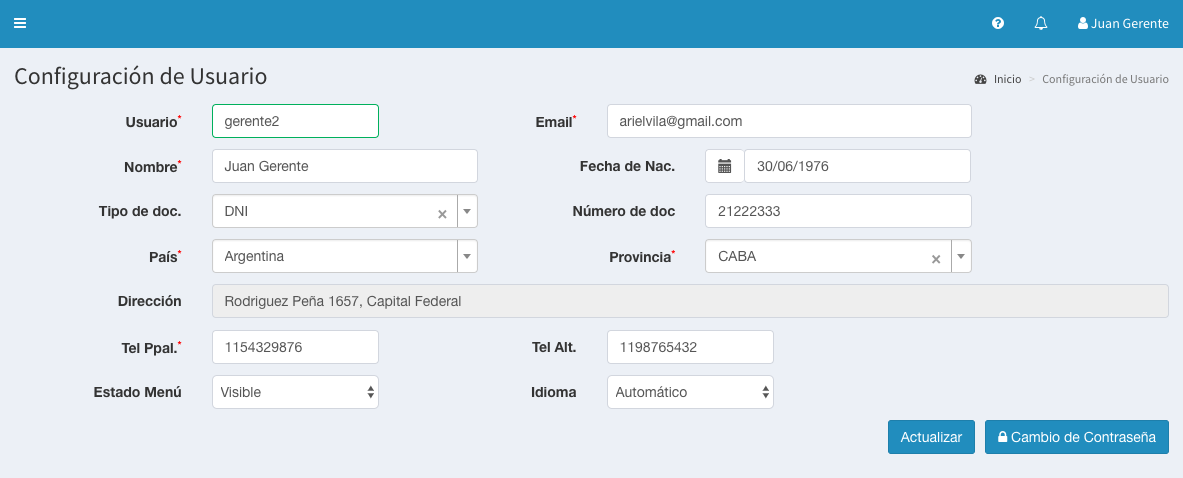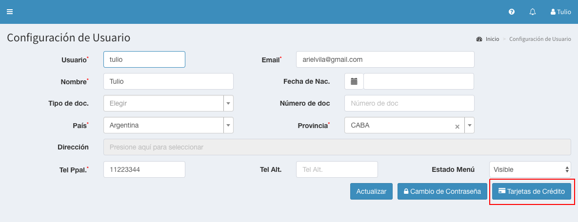Tabla de Contenidos Configuración de Usuario Datos del Usuario Cambio de Contraseña Tarjetas de crédito Configuración de Usuario Datos del Usuario Al hacer click en el nombre del usuario de la barra superior y luego en Configuración se muestra la pantalla de configuración del usuario conectado Usuario: Identificación del usuario. Es único en todo el sistema Email: Dirección que se utiliza para recibir notificaciones y otras comunicaciones Nombre: Nombre y Apellido del usuario Fecha de Nacimiento del usuario Tipo y Número de documento: Utilizado para identificar unívocamente al usuario Dirección del usuario: Calle, Número, Piso y Depto, Intersección, Localidad Teléfono Principal, Teléfono Alternativo: Teléfonos del usuario Estado Menú: Permite configurar si por default el menú lateral estará Visible u Oculto Idioma: Permite especificar el idioma preferido en Inglés, Español o Automático Cambio de Contraseña Presionando se accede al formulario de cambio de contraseña. Deberá ingresar su contraseña actual, la nueva contraseña y repetirla para que el sistema acepte el cambio. La contraseña debe tener una longitud mínima de 8 caracteres y contener al menos una letra minúscula, una mayúscula, un número (0-9) y un caracter especial (!@#$%) Tarjetas de crédito En esta pantalla tiene un botón que le permite acceder a la pantalla de configuración de Tarjetas de Crédito En la primer pantalla se muestran las tarjetas ya registradas. Con el botón puede dar de baja tarjetas ya registradas Importante: Esta información no se almacenará en nuestros servidores, sino que se enviará por medio de una conexión segura a MercadoPago, que se encargará de gestionarla. Al presionar en Registrar Tarjeta de Crédito se visualiza la pantalla que permite registrar una nueva tarjeta