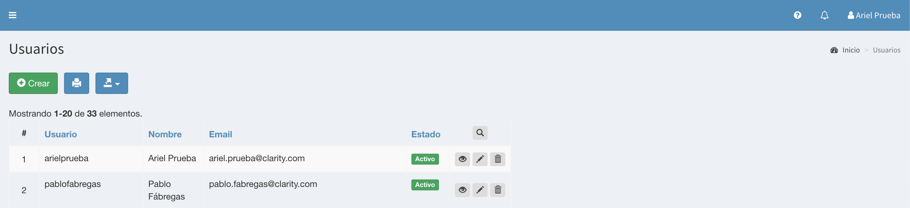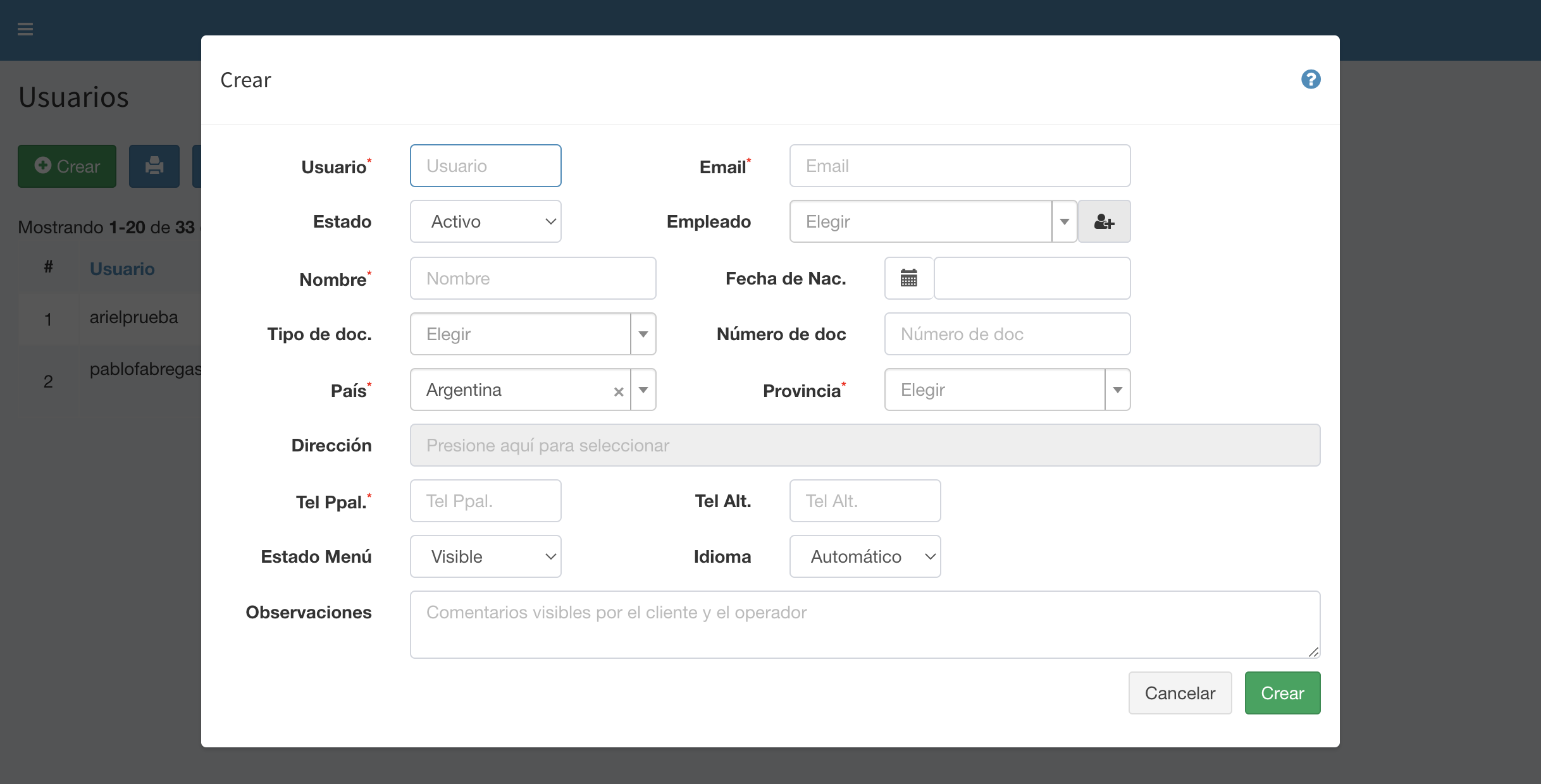 Tabla de Contenidos Usuarios del Sistema Listado Crear Empleado Usuarios del Sistema Listado Al ingresar a la opción Usuarios se muestra el listado de los usuarios del sistema. La visualización de esta funcionalidad depende de los permisos del usuario conectado. La ayuda en línea está confeccionada para un usuario con rol de Gerente, que puede ver todas las funcionalidades. Otros roles de usuarios pueden ver menos opciones. Crear Empleado Presionando el botón Crear se accede al formulario de creación de los usuarios. Usuario: Identificación del usuario. Es único en todo el sistema Email: Dirección en la que recibirá los datos del usuario creado, notificaciones y otras comunicaciones Estado: Activo / Inactivo Empleado: Selector del empleado correspondiente Nombre: Nombre y Apellido del usuario Fecha de Nacimiento del usuario Tipo y Número de documento: Utilizado para identificar unívocamente al usuario Calle, Número, Piso y Depto, Intersección, Localidad: Dirección del usuario Teléfono Particular, Teléfono Celular: Teléfonos del usuario Estado Menú: Permite configurar si por default el menú lateral estará Visible u Oculto Observaciones: Comentarios